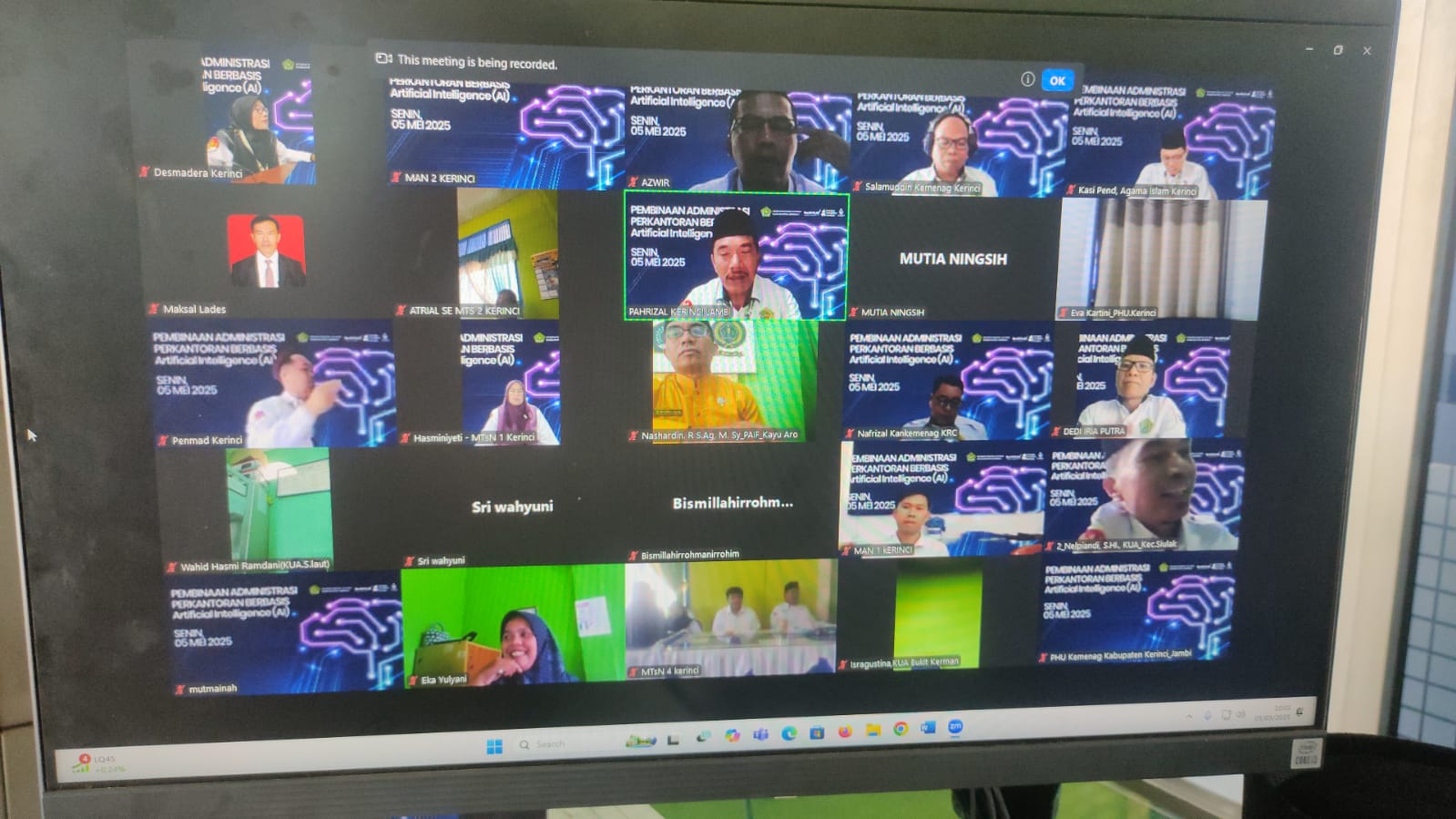 Kerinci, 5 Mei 2025 – Dalam rangka meningkatkan kualitas pelayanan administrasi yang lebih modern dan efisien, Kepala Madrasah Aliyah Negeri 2 Kerinci, Kepala Urusan Tata Usaha (Kaur TU), serta seluruh staf administrasi mengikuti Zoom Meeting bersama Kementerian Agama Kabupaten Kerinci. Kegiatan ini mengangkat tema “Pembinaan Administrasi Perkantoran Berbasis Artificial Intelligence (AI)â€.
